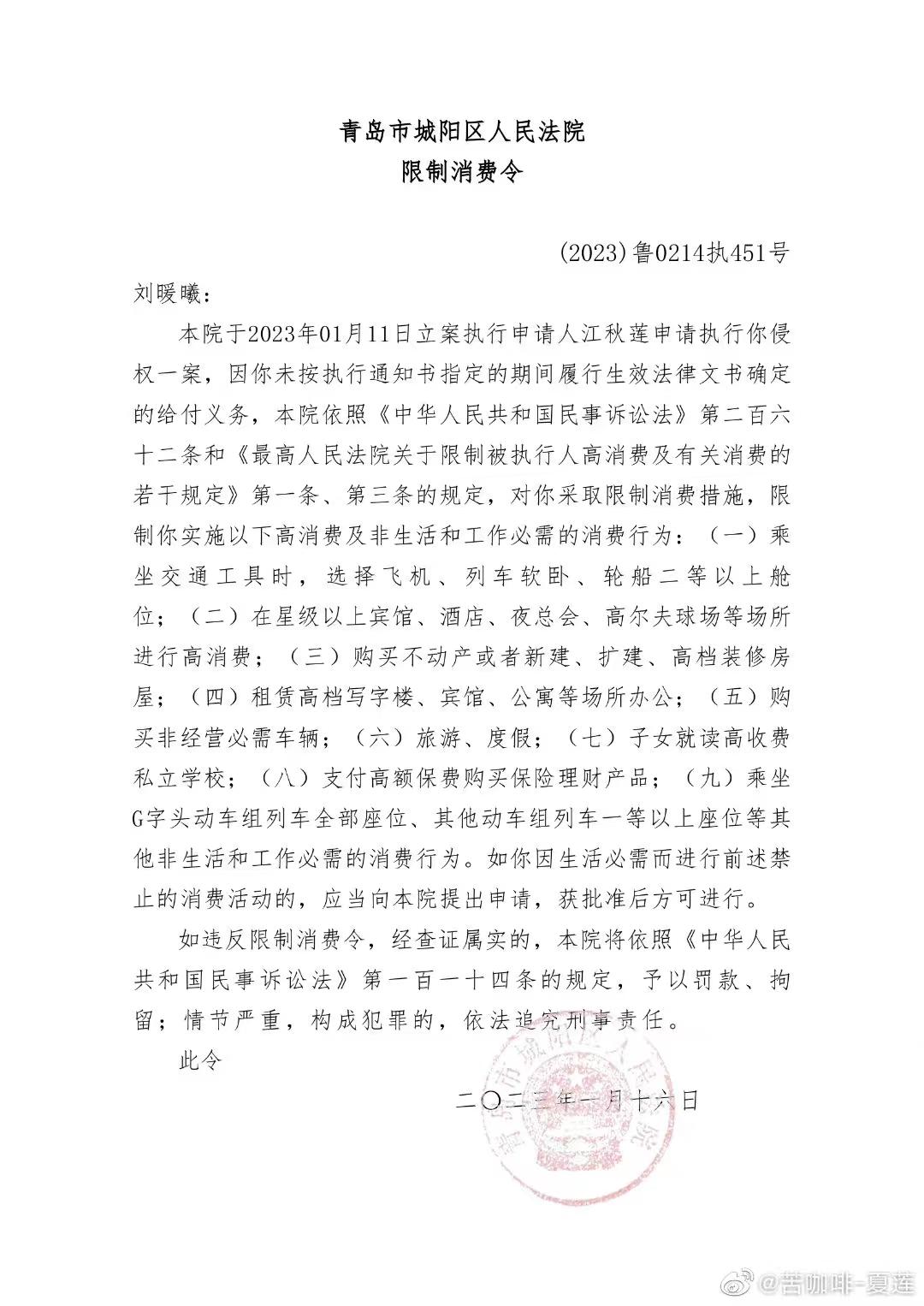 青岛法院已对刘鑫发布限消令(青岛刘鑫现状)